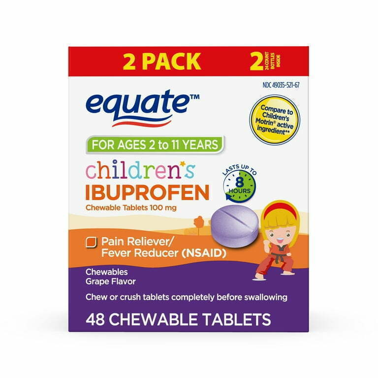 Os comprimidos mastigáveis de Ibuprofeno Infantil Equate contêm 100 mg de ibuprofeno, um anti-inflamatório não esteroidal (AINE), com ação analgésica e antitérmica. Proporcionam alívio de febre e dores leves por até 8 horas. São formulados para crianças de 2 a 11 anos e não contêm glúten nem conservantes. A apresentação em comprimido mastigável dispensa o uso de água ou copo dosador. São práticos para uso fora de casa.