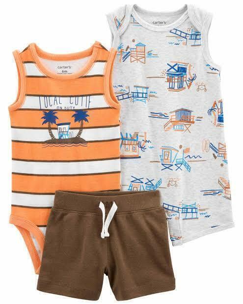 Kit, trio da Carter's vem com um romper, um body e um short, confeccionado em tecido macio e confortável.