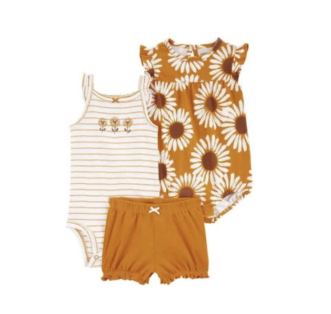 Kit, trio da Carter's vem com um romper, um body e um short, confeccionado em tecido macio e confortável.