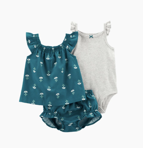 Kit trio Carter’s com um body, short e uma linda blusa, feitos em tecido macio e confortável. Ideal para o dia a dia, com design moderno e estampas encantadoras.
